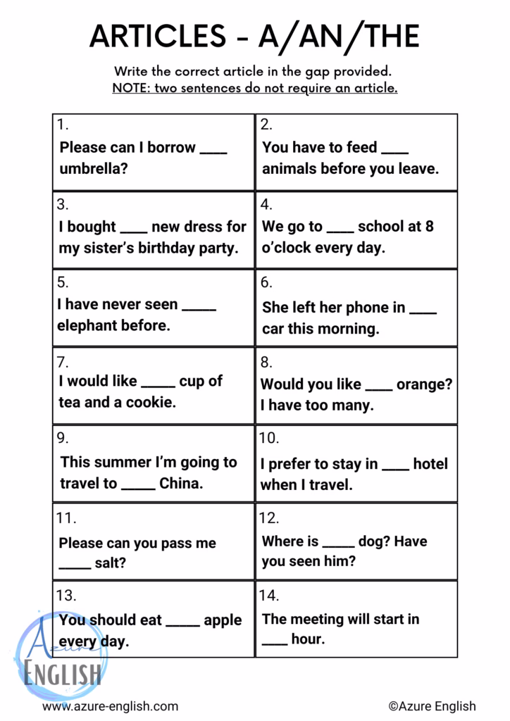 Here you can find worksheets to help you or your students study the indefinite articles (a and an), and the definite article (the). Suitable for all ages and abilities. If you have any requests, please contact us.