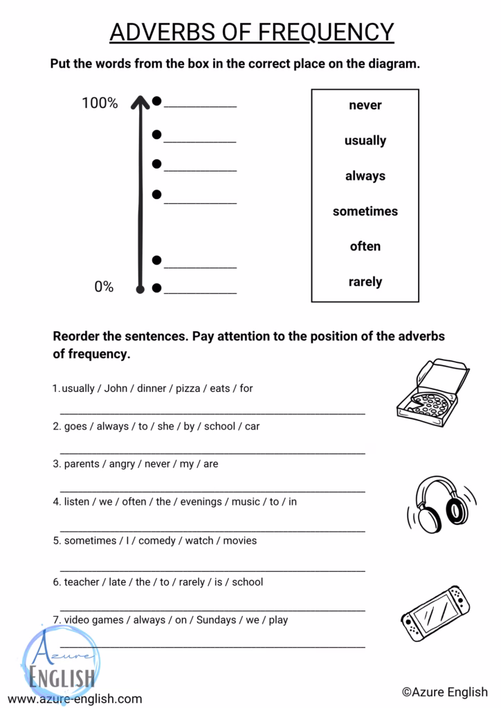 Students are asked to insert the provided adverb in the correct place in the diagram. Then they need to reorder the sentences, paying attention to the placement of the adverb of frequency.