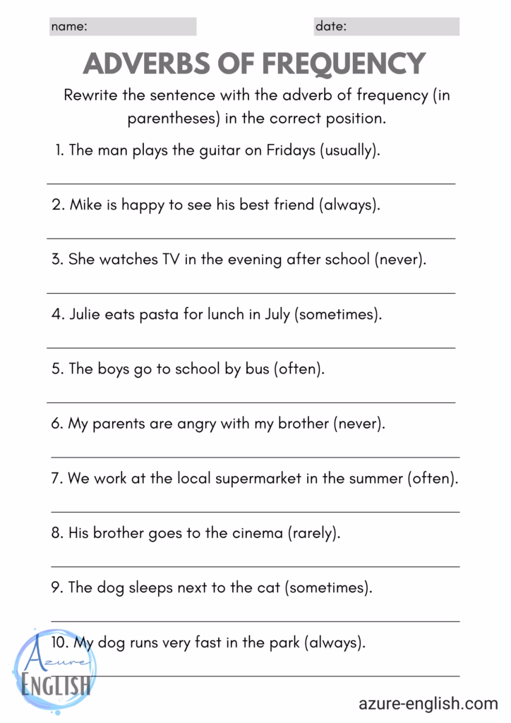 Students are asked to insert the provided adverb in the correct place in the sentence.
