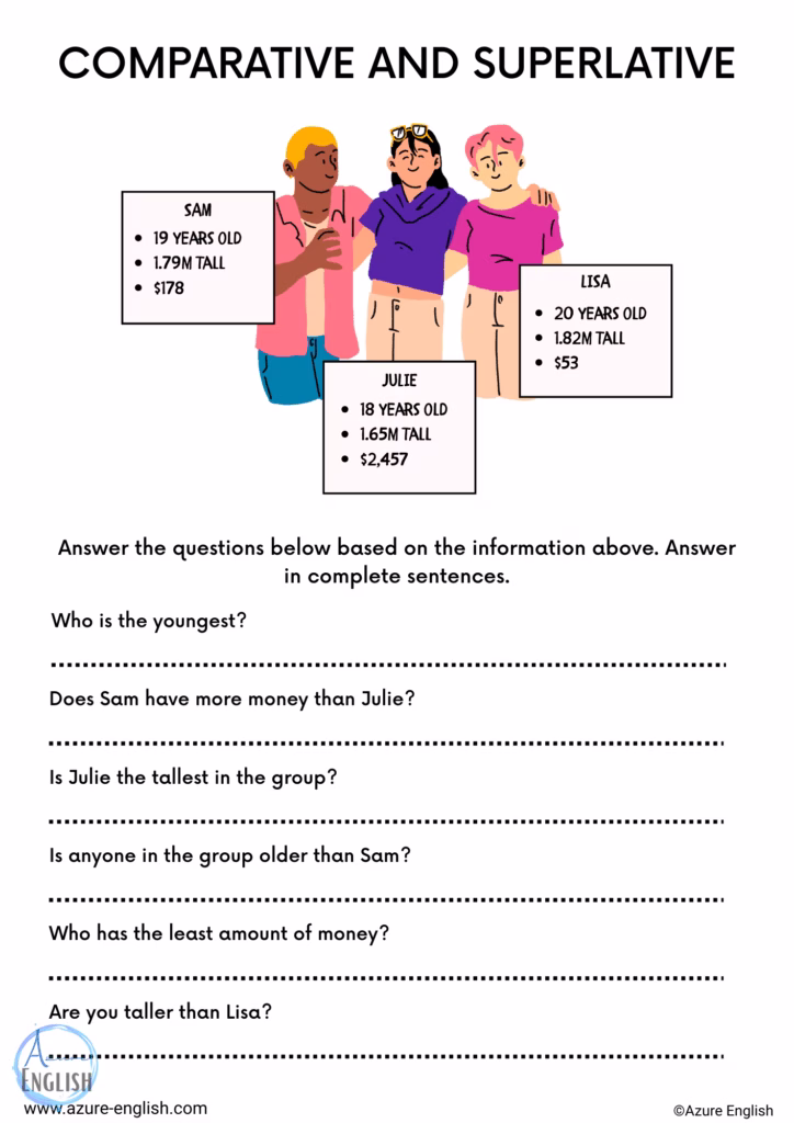 TOP TIP: Ask students to write a few sentences of their own! They can write about whatever they want as long as they use superlatives and/or comparatives!