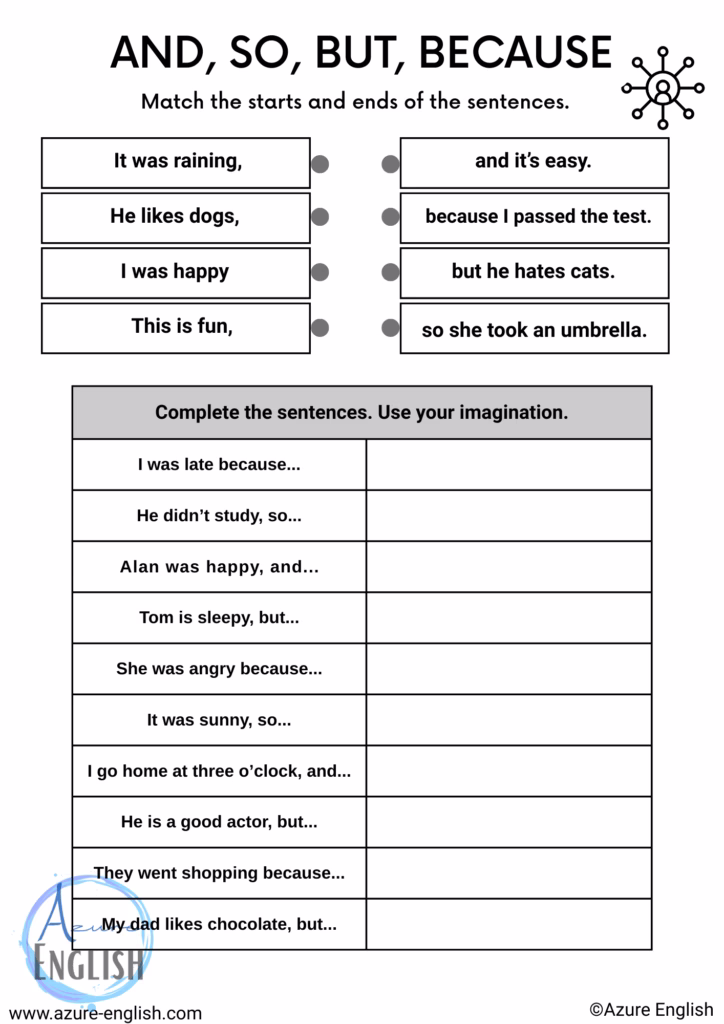This worksheet exercises the connectors and, so, but, and because. Students are first asked to connect the starts and ends of sentences. Following this, they need to use their imagination to complete 10 sentences.