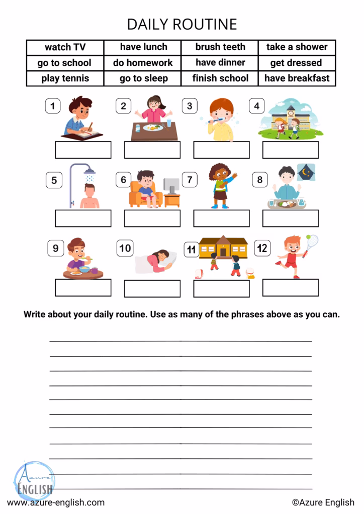 Students are asked to match the DAILY ROUTINE vocabulary provided with the correct image. Following this, students are required to write about their own daily routines.