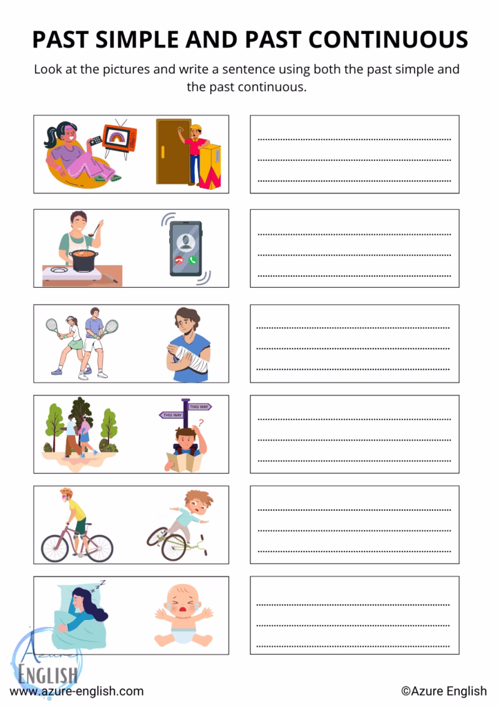 Students are asked to look at the images and write a sentence using both the past continuous and the past simple.
