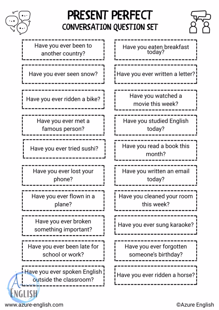TOP TIP: Extra activity idea: ask students to write their own questions using the present perfect. They can then ask their classmates and record the answers.