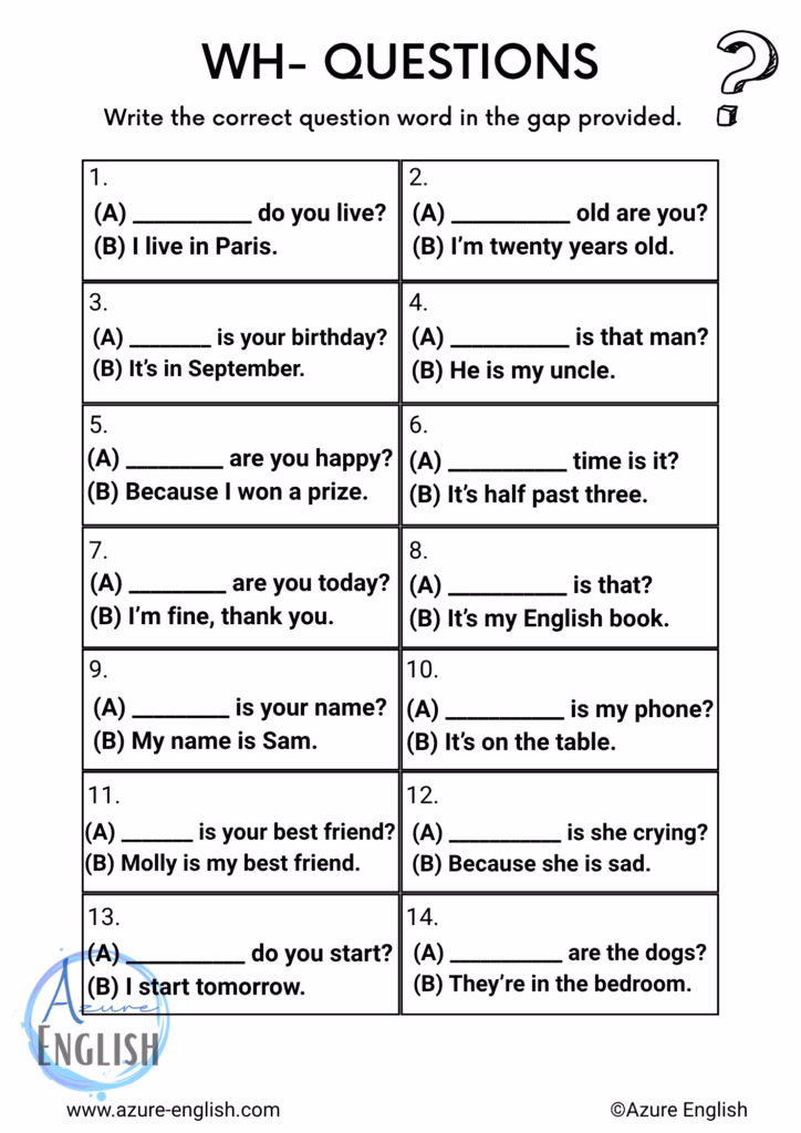 This is a fill-the-gap worksheet that tests a student’s understanding of the Wh- Question words in English.
