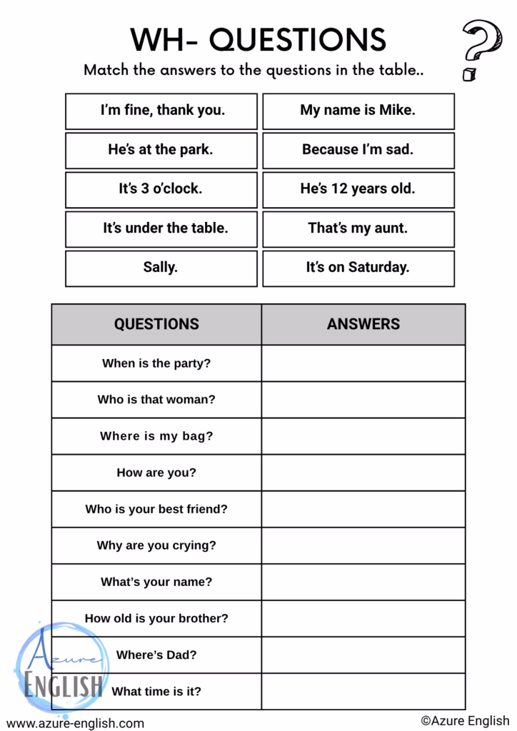 This is a matching worksheet that tests a student’s understanding of the Wh- Question words in English. Students are required to match the answers to the questions.