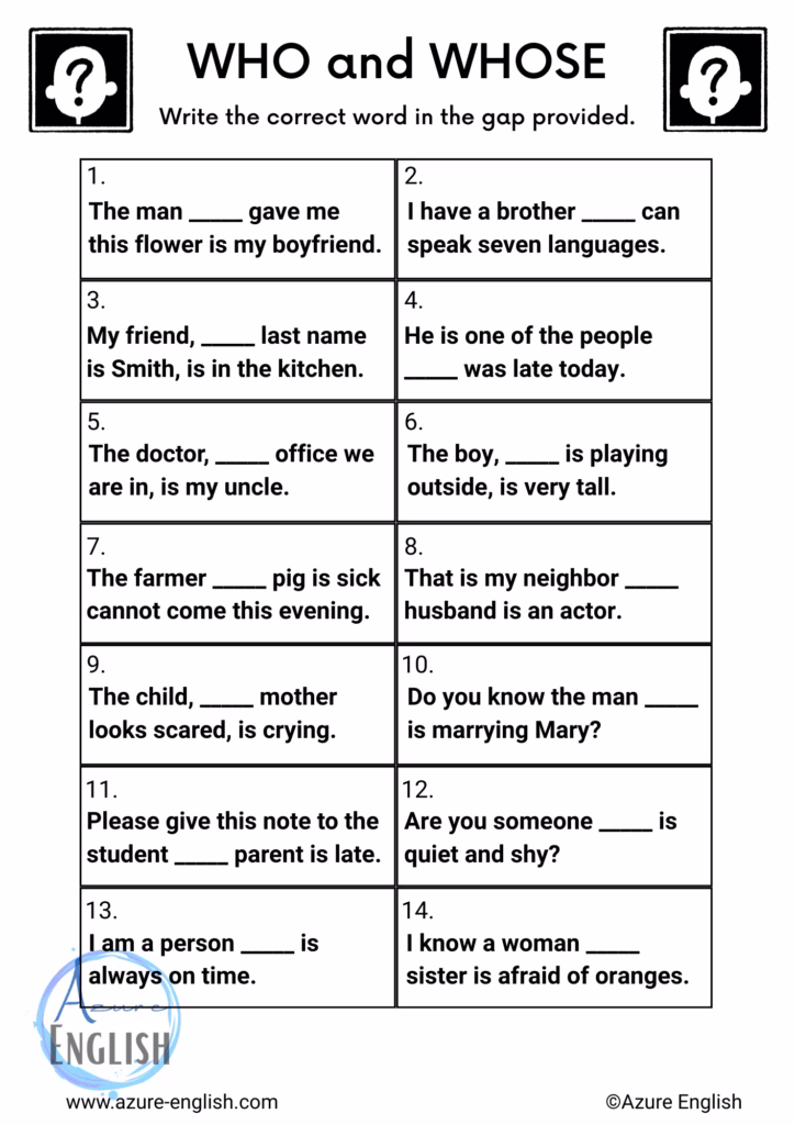This is a fill-the-gap worksheet that tests a student’s understanding of the difference between WHO and WHOSE in English.